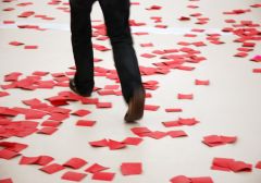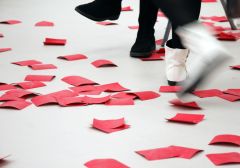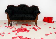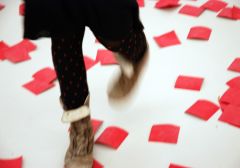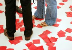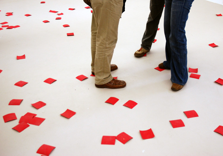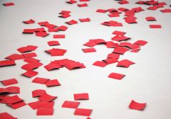 Material: rote Papierquadrate mit dem Aufdruck "was ist ein Quadrat", 4 rote Filztaschen